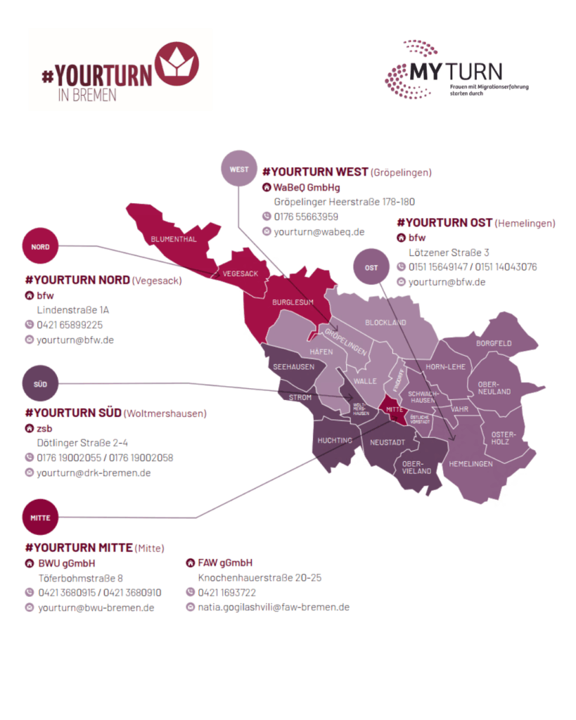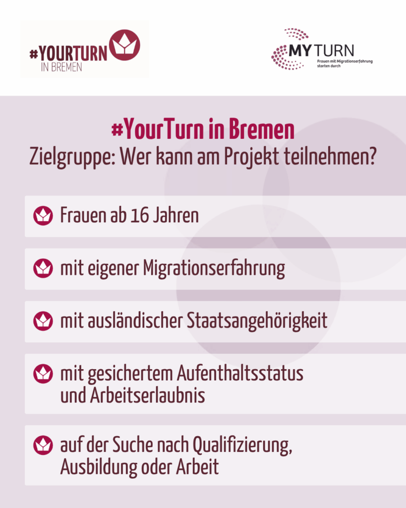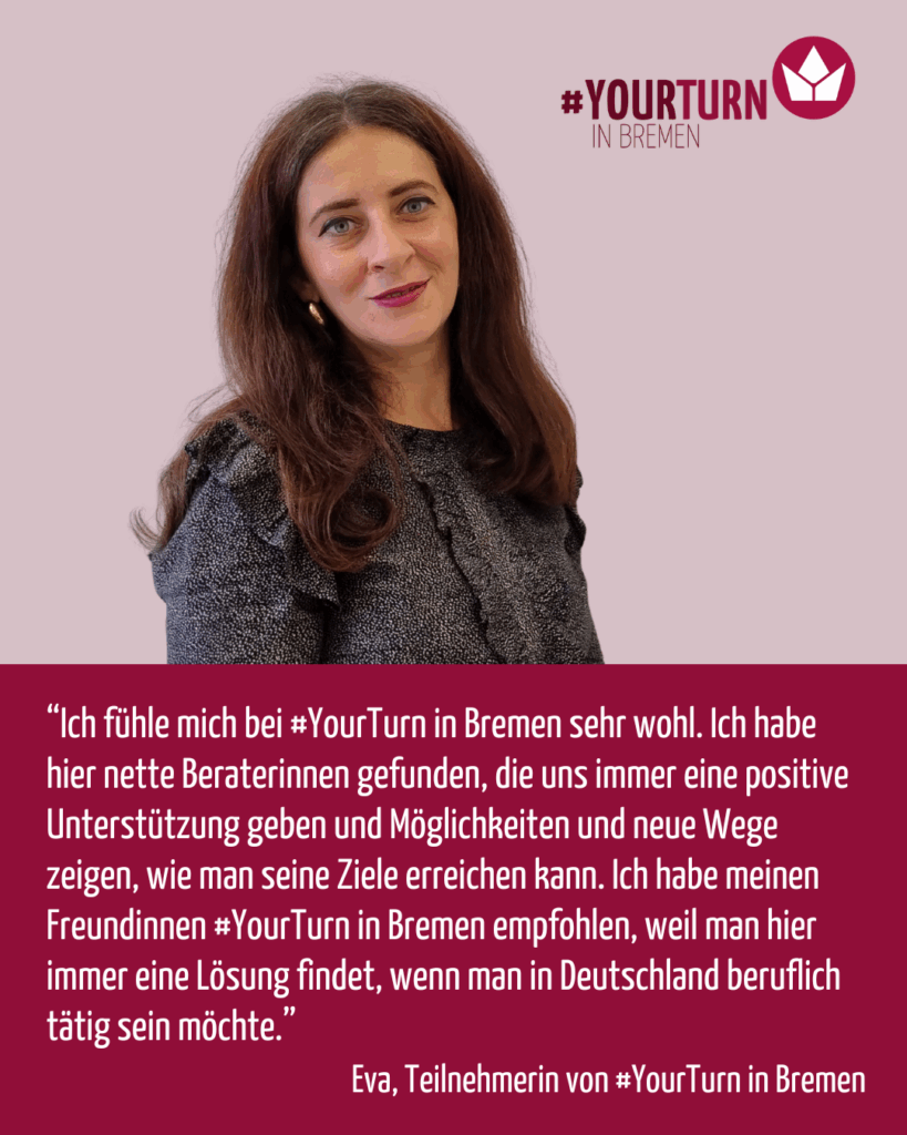 “Ich fühle mich bei #YourTurn in Bremen sehr wohl. Ich habe hier nette Beraterinnen gefunden, die uns immer eine positive Unterstützung geben und Möglichkeiten und neue Wege zeigen, wie man seine Ziele erreichen kann. Ich habe meinen Freundinnen #YourTurn in Bremen empfohlen, weil man hier immer eine Lösung findet, wenn man in Deutschland beruflich tätig sein möchte.”