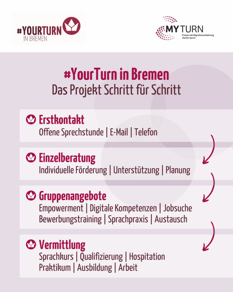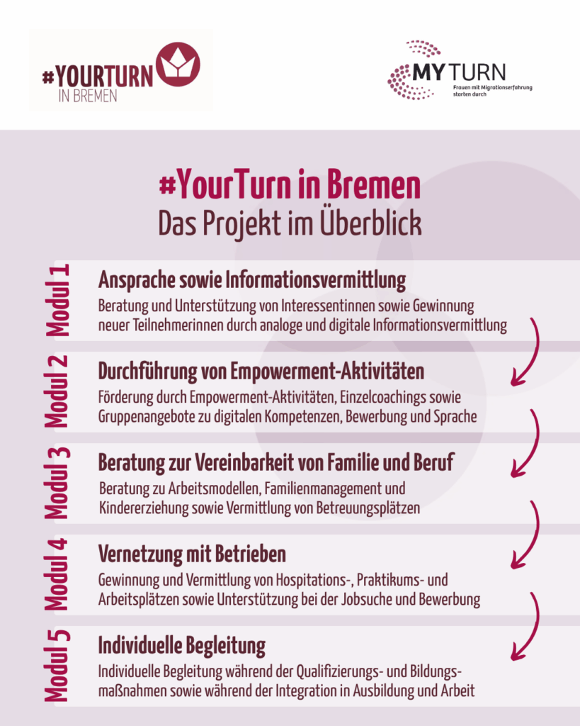 Das Projekt #YourTurn in Bremen ist in fünf Module gegliedert. So können wir Frauen mit Migrationserfahrung optimal auf ihrem Weg in Qualifizierung, Ausbildung oder Arbeit beraten, unterstützen und begleiten.