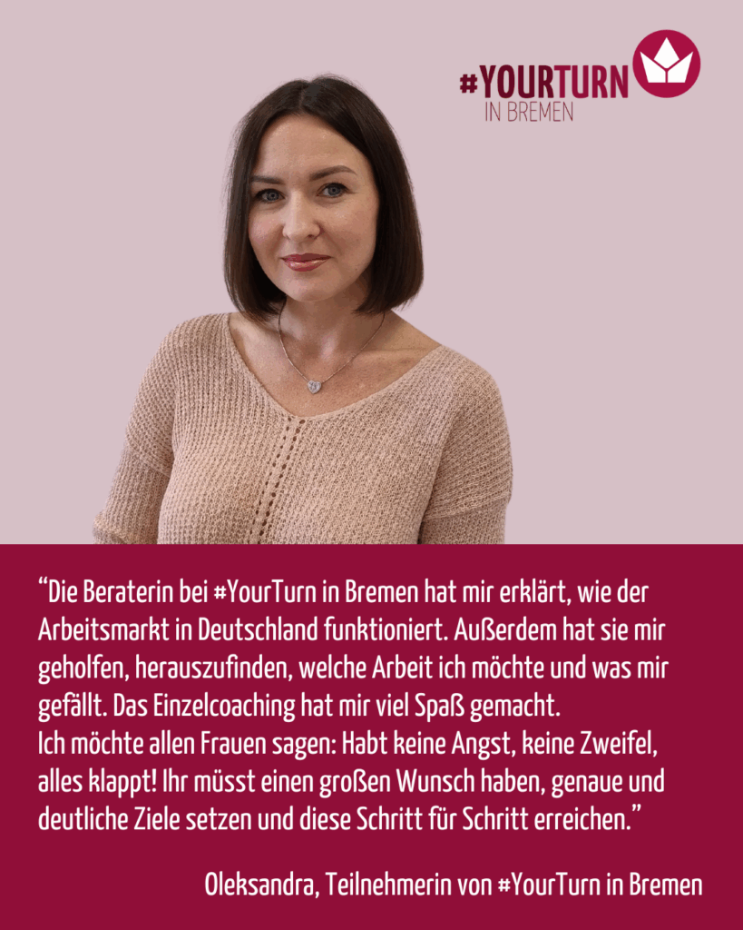 “Ich heiße Oleksandra und ich komme aus der Ukraine. Ich wohne seit dreieinhalb Jahren in Bremen. Ich habe über das Jobcenter von #YourTurn in Bremen erfahren und bin seit Mai 2024 im Projekt. Durch #YourTurn in Bremen habe ich eine Ausbildung als Verwaltungsfachangestellte gefunden. Ich empfehle allen Frauen, sich an #YourTurn in Bremen zu wenden, weil hier professionelle Menschen arbeiten, welche bei allen Fragen sehr gerne helfen.”