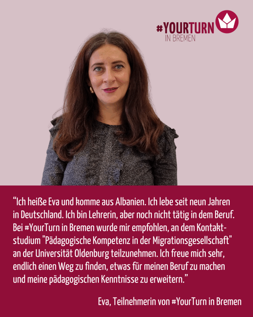 “Ich heiße Eva und komme aus Albanien. Ich lebe seit neun Jahren in Deutschland. Ich bin Lehrerin, aber noch nicht tätig in dem Beruf. Bei #YourTurn in Bremen wurde mir empfohlen, an dem Kontaktstudium „Pädagogische Kompetenz in der Migrationsgesellschaft“ an der Universität Oldenburg teilzunehmen. Ich freue mich sehr, endlich einen Weg zu finden, etwas für meinen Beruf zu machen und meine pädagogischen Kenntnisse zu erweitern.”