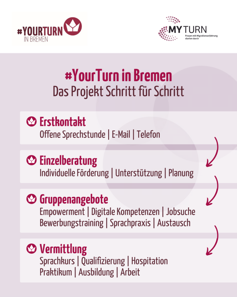 Wir möchten uns ganz herzlich bei allen Partner/innen, Wegbegleitenden und Teilnehmerinnen des Projekts #YourTurn in Bremen bedanken! Wir freuen uns riesig, dass es im Januar 2026 weitergeht!