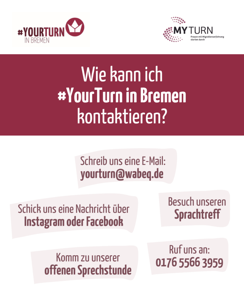 #YourTurn in Bremen ist auch auf Instagram und Facebook. Dort findest du aktuelle Informationen zum Projekt, Veranstaltungen und Gruppenangebote, Alltagstipps und vieles mehr.
