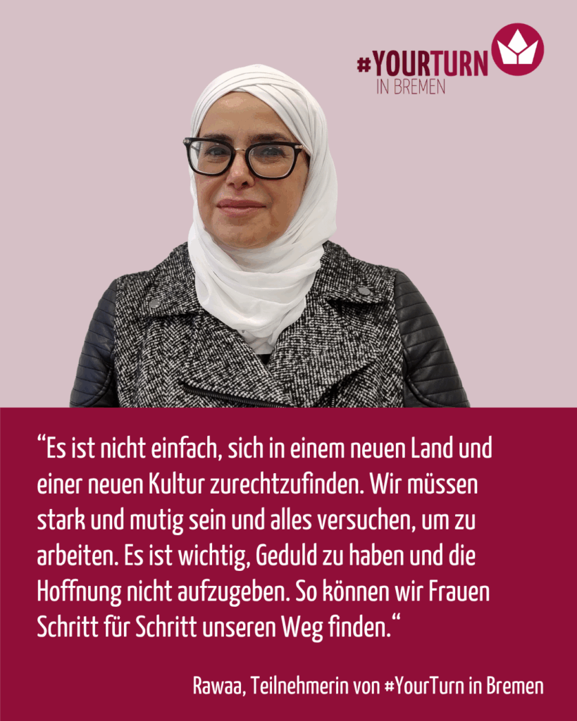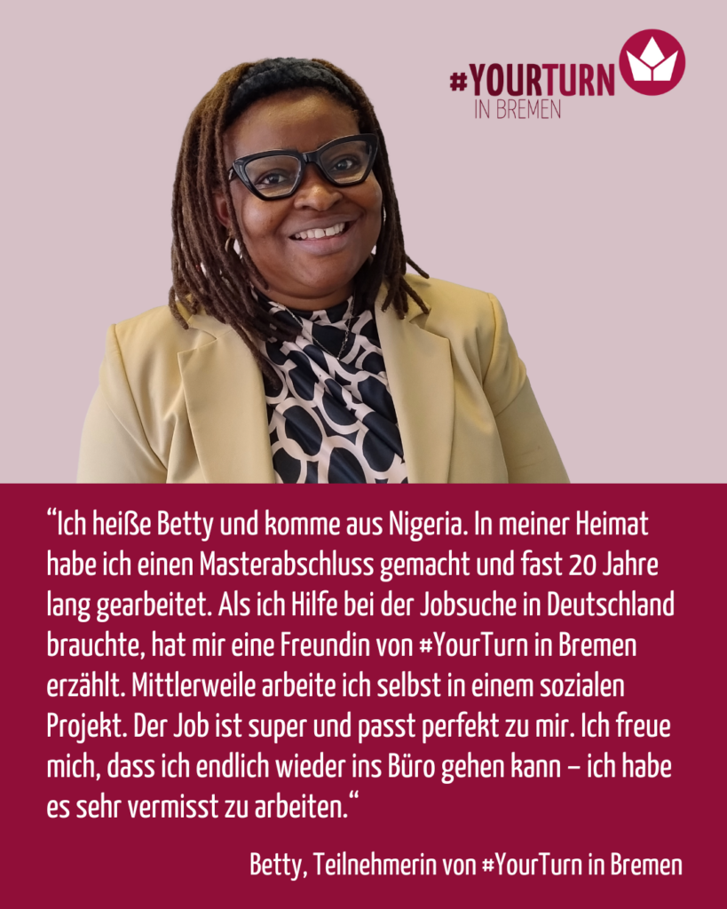 “Ich heiße Betty und komme aus Nigeria. In meiner Heimat habe ich einen Masterabschluss gemacht und fast 20 Jahre lang gearbeitet. Als ich Hilfe bei der Jobsuche in Deutschland brauchte, hat mir eine Freundin von #YourTurn in Bremen erzählt. Mittlerweile arbeite ich selbst in einem sozialen Projekt. Der Job ist super und passt perfekt zu mir. Ich freue mich, dass ich endlich wieder ins Büro gehen kann – ich habe es sehr vermisst zu arbeiten.“